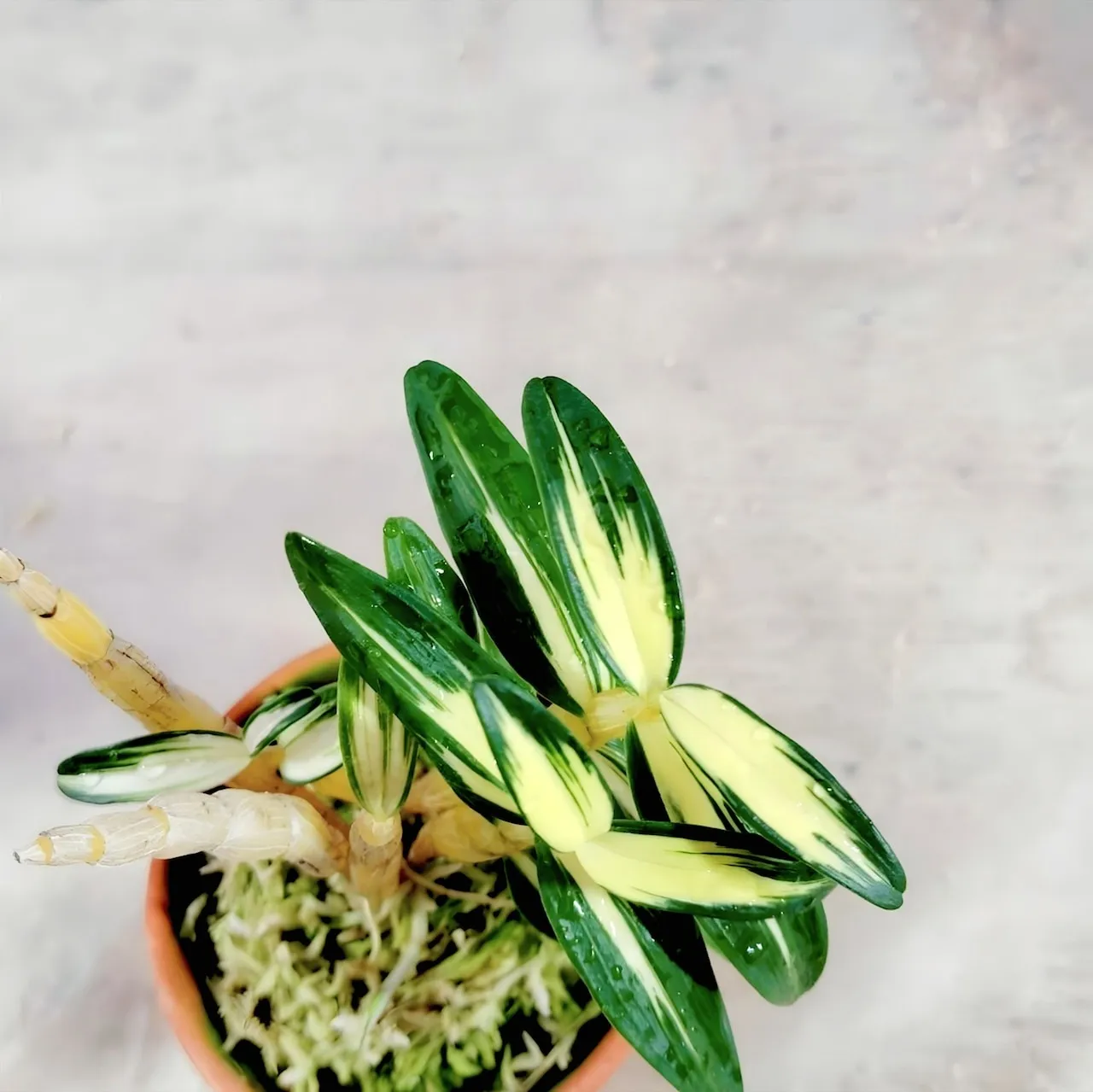 富貴の光は、斑入りの葉が美しく、ピンクの花を咲かせるセッコクです。
